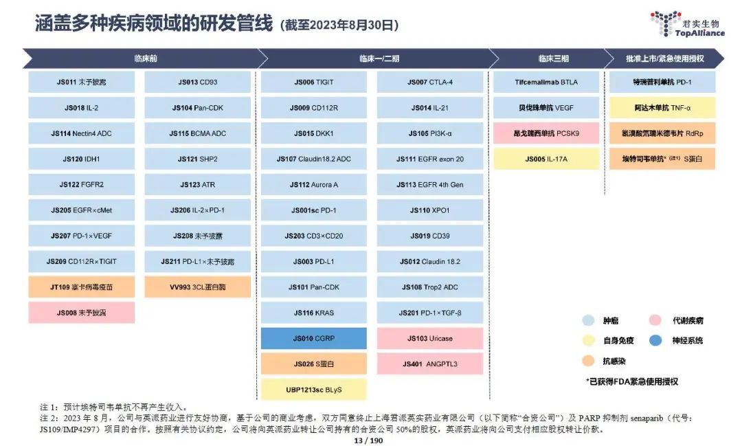 以2023上半年为例,截至2023年8月30日,君实生物拥有近50条在研管线,仅有三款产品实现商业化,分别为特瑞普利单抗(商品名:拓益)、氢溴酸氘瑞米德韦片(商品名:民得维)、阿达木单抗(商品名:君迈康)。
