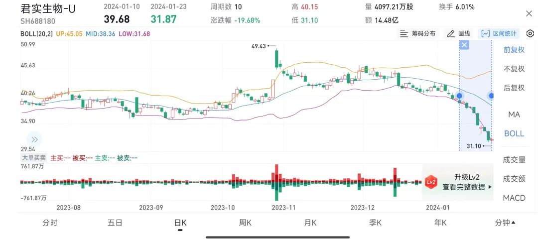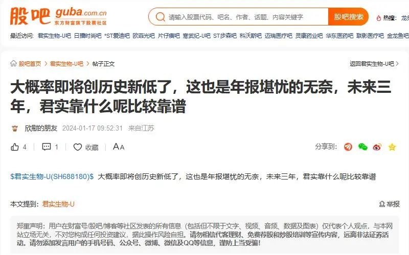话虽如此,从股价走势看投资者似乎并不买账。1月10日至23日,君实生物股价累跌约20%。浏览股吧,一些股民言辞悲观“大概率即将创历史新低了,这也是年报堪忧的无奈,未来三年,君实靠什么呢?”