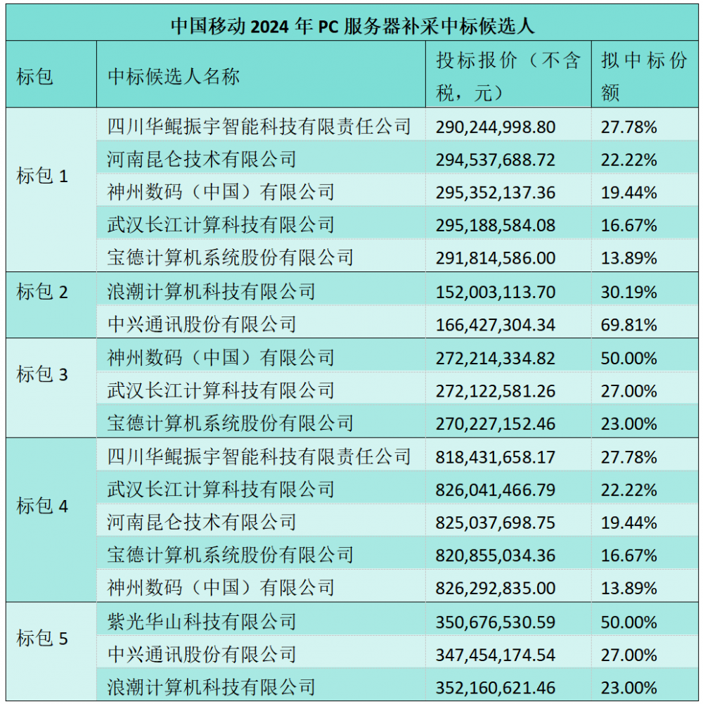 C114讯 9月30日消息(九九)中国移动采购与招标网日前发布2024年PC服务器产品集中采购项目(补充采购)中标候选人公示,华鲲振宇等八厂商中标中标。