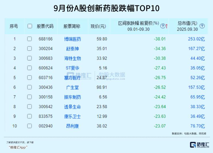 跌幅TOP4:激烈分化的创新药