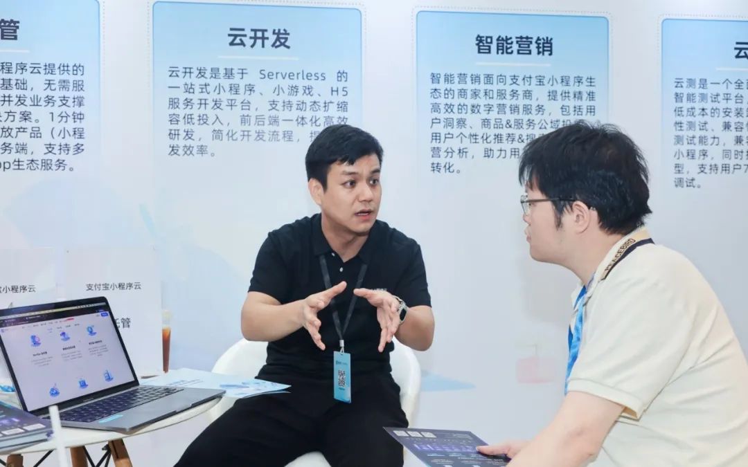 支付宝小程序云产品经理源亦(左一)在和客户交流。 来源:被访者提供2022年3月,支付宝小程序云正式立项,目的是更好地服务生态内的中小商家。