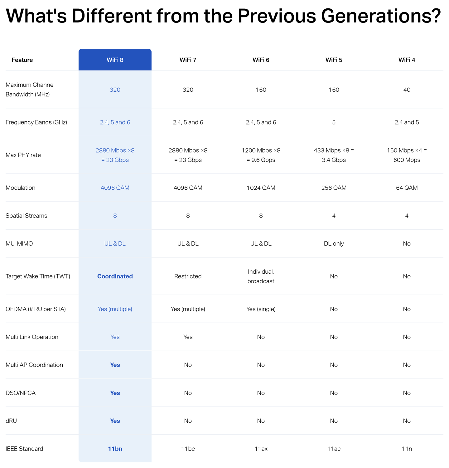 根据 TP-Link 官网提供的 Wi-Fi 8 规范介绍,802.11bn 相较于现有的 Wi-Fi 7 (802.11be) 并未在速率上限方面做出更进一步的提升,320MHz 最大信道宽度、2.4GHz / 5GHz / 6GHz 三频段、4096 QAM 调制、8 空间流、23Gbps 最大 PHY 速率均保持不变。