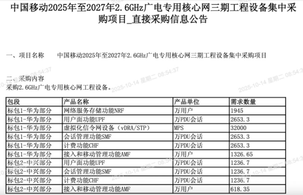 C114讯 10月14日消息(九九)中国移动采购与招标网日前发布2025年至2027年2.6GHz广电专用核心网三期工程设备集中采购项目直接采购信息公告,华为、中兴中标。