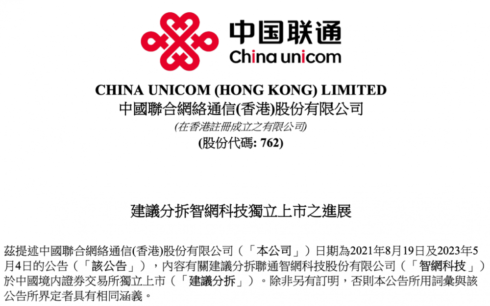 C114讯 10月22日消息 今日,中国联通发布公告称,公司拟分拆智网科技至深圳证券交易所(“深交所”)创业板上市。