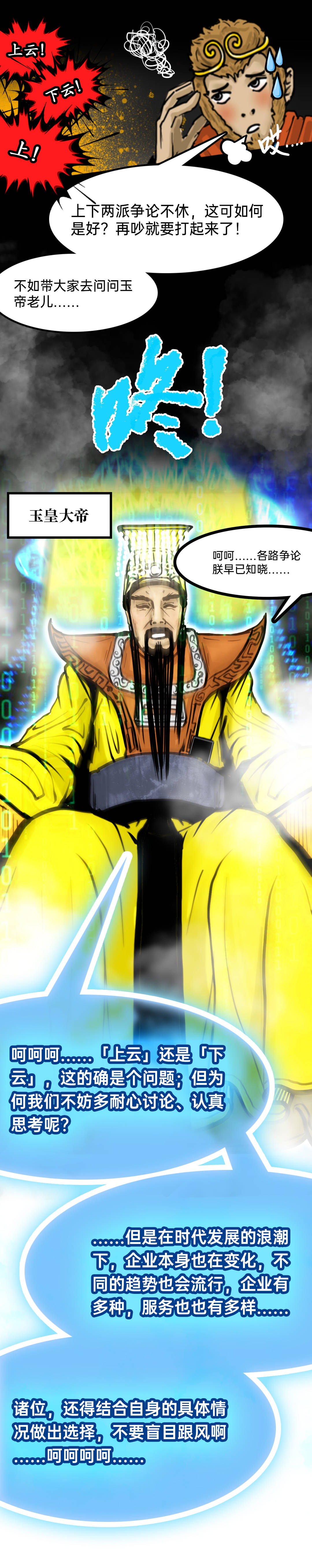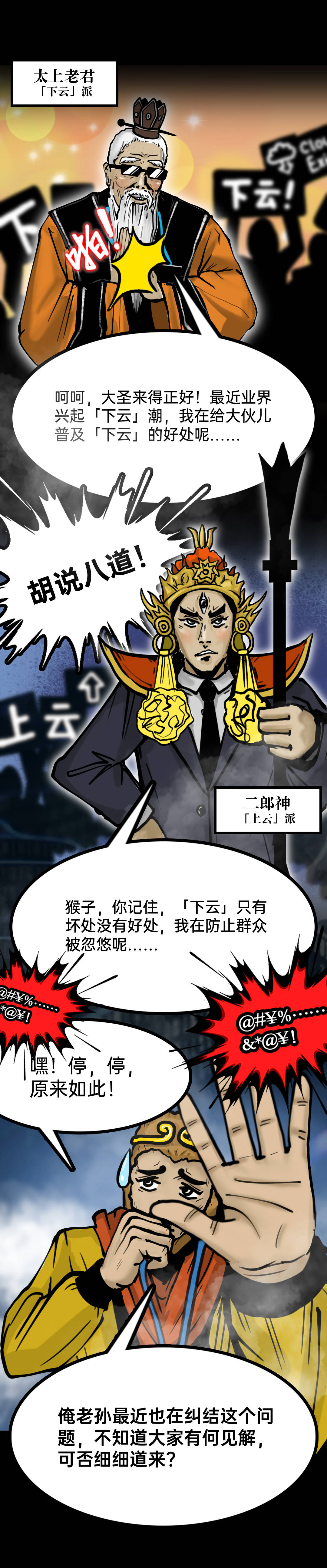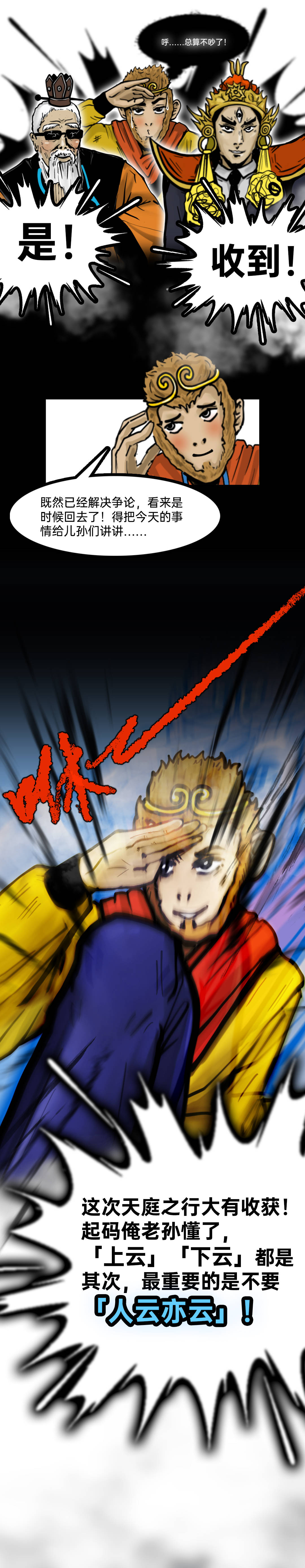眼看就要打起来了,孙悟空连忙带着他们去找玉皇大帝,最后得到启发:不管“上云”还是“下云”,最重要是不要“人云亦云”!
