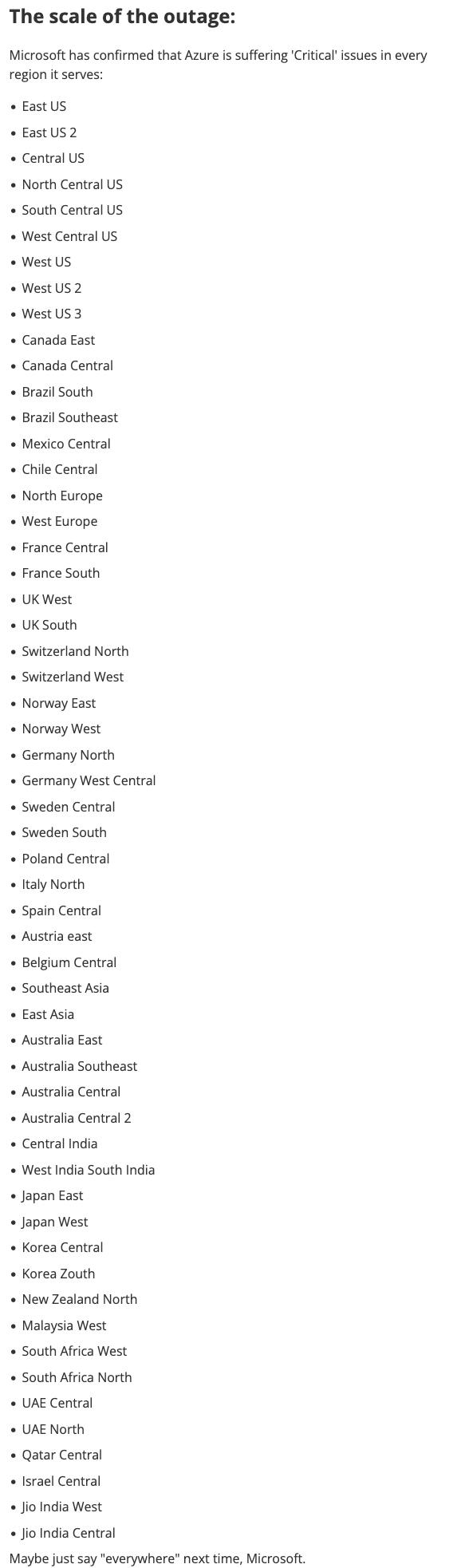 谈到故障影响范围,外媒 Tom’s Hardware 整理了微软确认的受影响服务和地区,最后甚至调侃道:“微软下次或许可以直接说‘无处不在’就行了!”