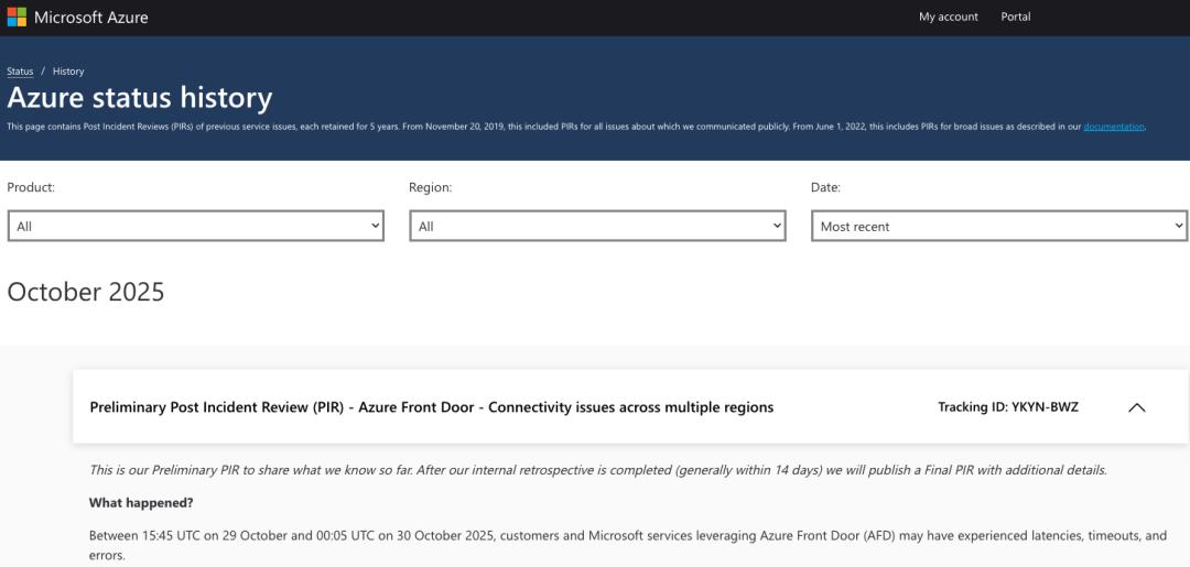 不过,微软也在初步报告中指出,“目前客户对 AFD 的配置修改仍处于暂时冻结状态。解除后我们将另行通知。虽然整体的错误率与延迟已恢复到事发前水平,但仍有少量客户存在尾部问题,我们正在持续修复中。相关更新将通过 Azure Service Health 直接推送。”