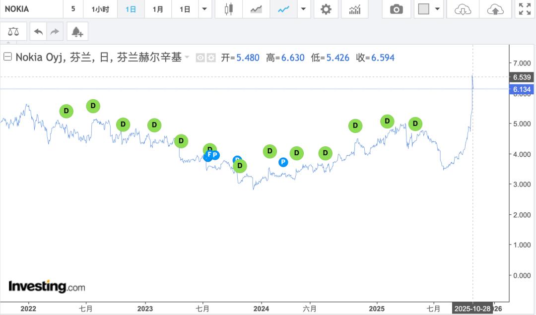 与稳健的营收相比,诺基亚在二级市场的表现似乎“平平无奇”。但在28日英伟达官宣合作之后,诺基亚股价迎来涨势,当日报收6.59欧元/股,涨超20%,创下近五年新高。