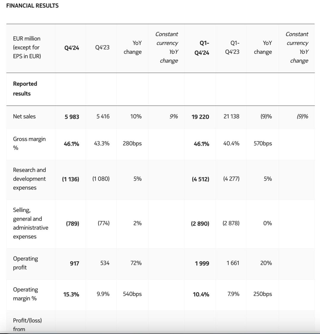2025年1月,诺基亚发布2024年财务报告。财报显示,全年净销售额192.2亿欧元,净利润12.84亿欧元,同比增长89%。