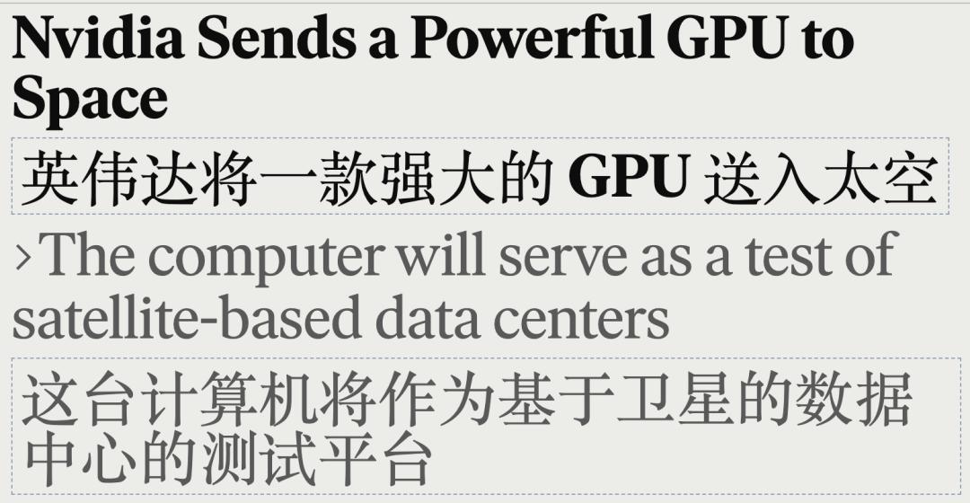 11月2日,星期日,英伟达首次将H100 GPU送入太空,以测试数据中心在轨道上的运行方式。