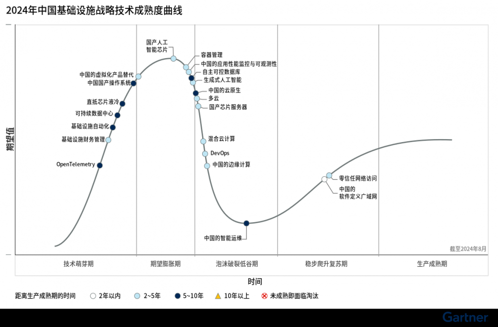 C114讯 9月20日消息(岳明)近日,Gartner首次发布2024年中国基础设施战略技术成熟度曲线,该曲线收录的21项技术主要覆盖自主可控计划、AI 影响、运营效率以及基础设施现代化等四大领域。