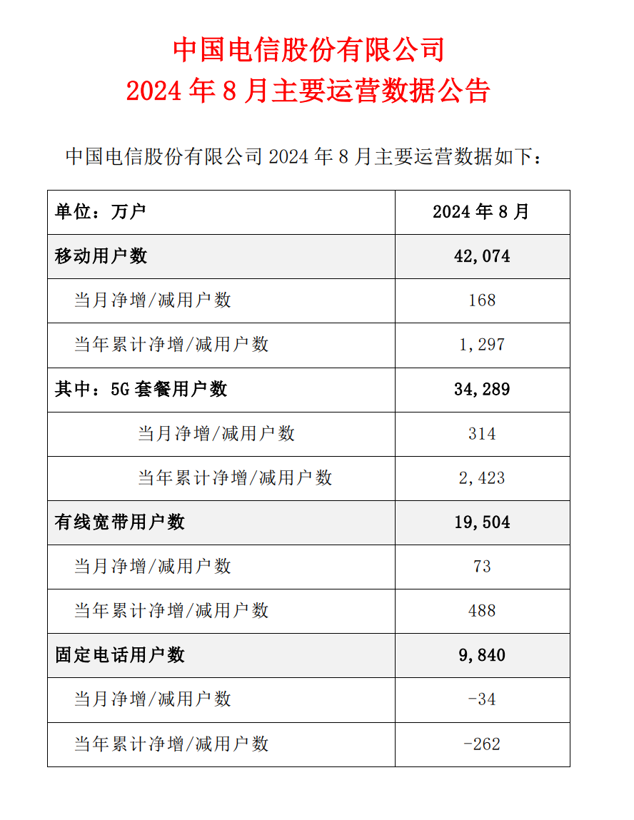 C114讯 9月20日消息(水易)今日,中国电信公布了2024年8月主要运营数据。当月,中国电信移动用户数净增168万户,移动用户数累计4.2074亿户。其中,5G套餐用户净增314万户,5G套餐用户数累计3.4289亿户。