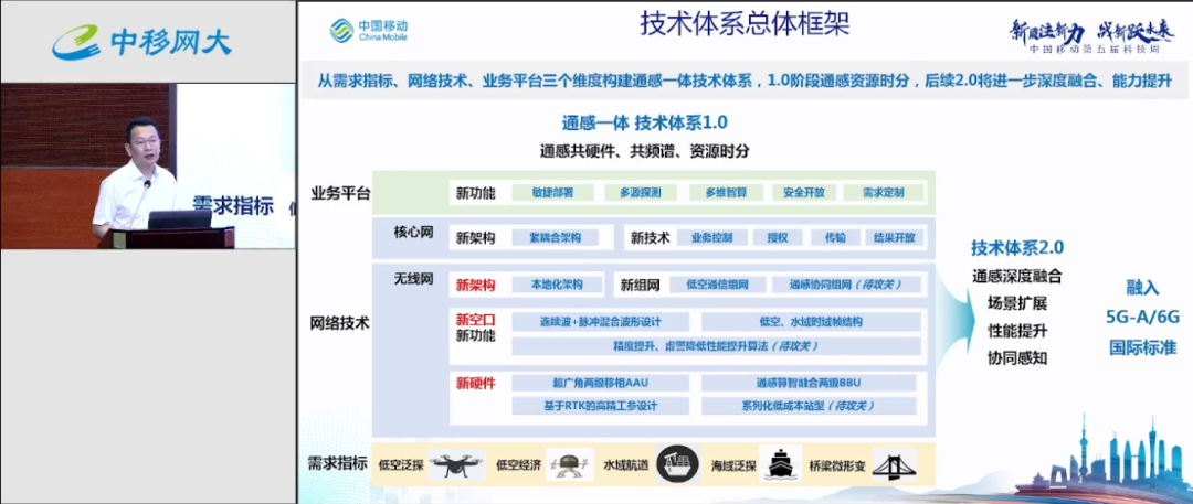 “为了均衡地推动‘通感一体’发展,中国移动从需求指标、网络技术、业务平台三个维度出发,构建‘通感一体’技术体系。技术体系1.0聚焦通感共硬件、共频谱、资源时分;技术体系2.0将采用通感深度融合,实现场景扩展、性能提升、协同感知,进而融入5G-A/6G国际标准。”陈其铭介绍道。