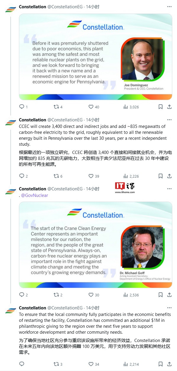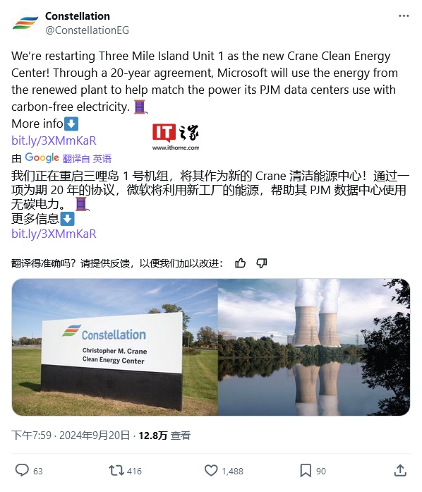 IT之家 9 月 21 日消息,AI 的尽头是核电?《华盛顿邮报》昨日(9 月 20 日)报道,微软公司和星座能源公司(Constellation Energy)达成协议,未来 20 年内购买三里岛核电站 100% 能源。