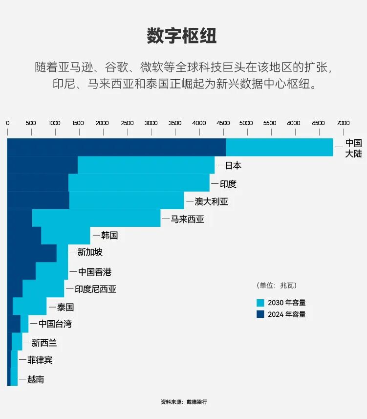 戴德梁行称,有了这笔巨额支出,再加上地区参与者的投资,2030年该地区的数据中心容量预计将从2024年的12吉瓦增长逾一倍,达到29吉瓦以上。该公司补充说,到本十年末,该地区很可能成为全球第二大数据中心市场,仅次于将建成32吉瓦容量的美洲。