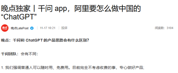 关于千问App和ChatGPT有什么区别,千问团队这样回答:我们希望ChatGPT有的能力我们都有,很多会快速上线。另一方面,ChatGPT没有的我们也有,主要就是阿里生态里的各种agent服务,内部业务合作、协同的程度会更深。