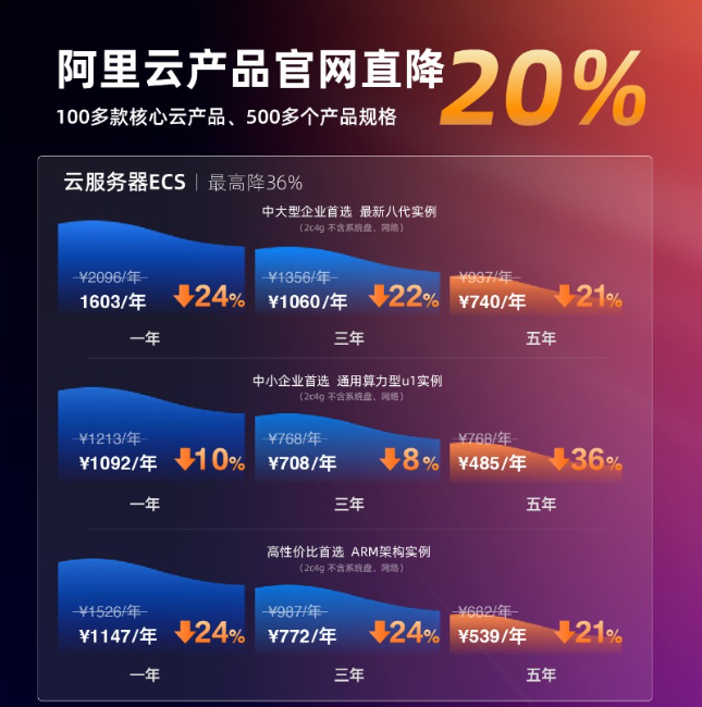 仅在1个月前,阿里云才宣布史上最大降价:“平均降幅超20%,最高降幅55%,涉及100多款产品、500多个规格,覆盖计算、存储、数据库等所有核心产品。”