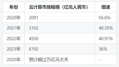过去4年,中国云计算市场规模每年呈30%以上的增速成长。2020年约为2091亿元,2021年为3102亿元,2022年增至4550亿元,去年增至6192亿元。
