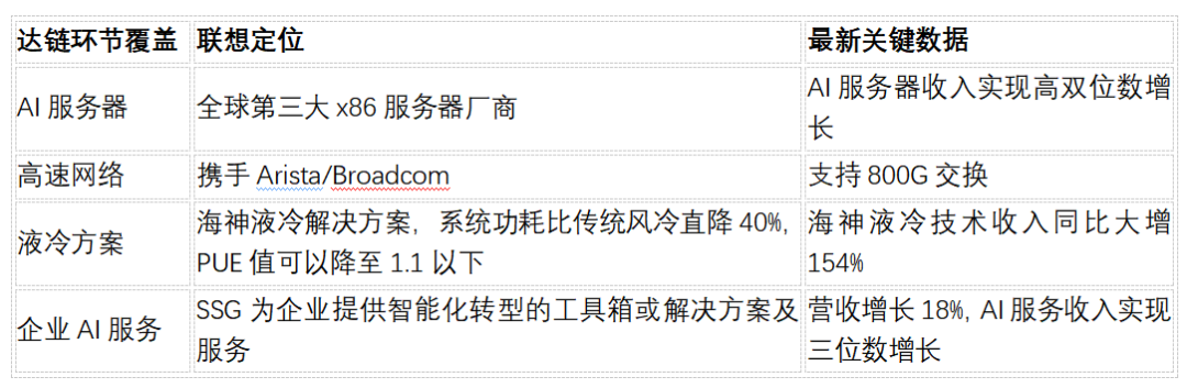 市场更容易关注联想集团的PC业务而忽略了其在AI时代达链的卡位;实际上公司已深度嵌入数据中心每一环:从服务器→ 网络 → 液冷 → 部署&服务。联想集团不再是“卖电脑的”,而是“算力基座”——从硬件到服务,从端侧推理到云端训练,全栈覆盖。