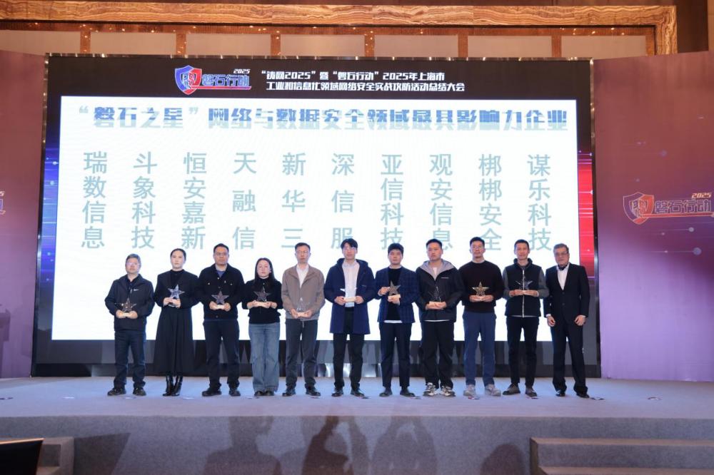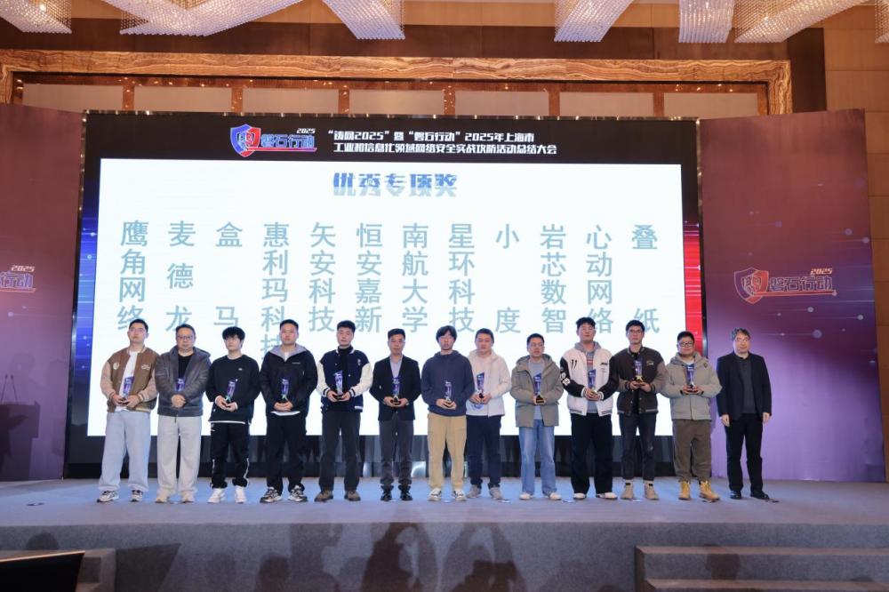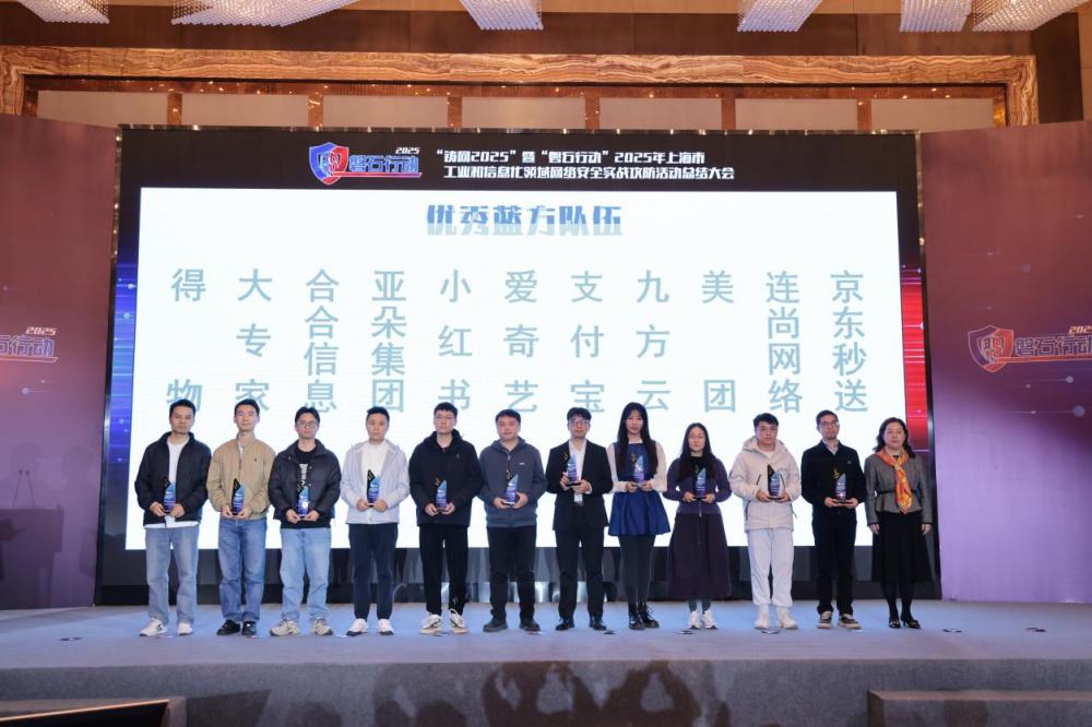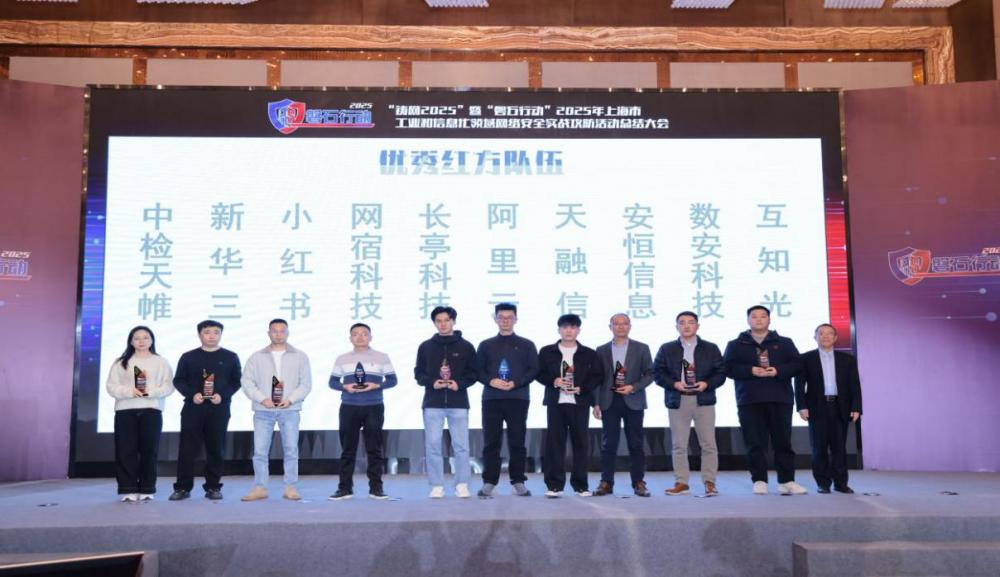 在颁奖仪式环节,与会领导分别为获奖单位颁发了优秀红方队伍、优秀蓝方队伍、优秀裁判单位、优秀组织单位、优秀支持单位,卓越应急奖、突出进步奖、突出战果奖、飞扬新锐奖、优秀技战法奖、优秀专项奖,并对2025年获得“磐石之星——上海市互联网行业网络与数据安全最具影响力企业和上海市互联网行业网络与数据安全本土最具实力企业”称号的企业进行表扬。(获奖单位名单附后)
