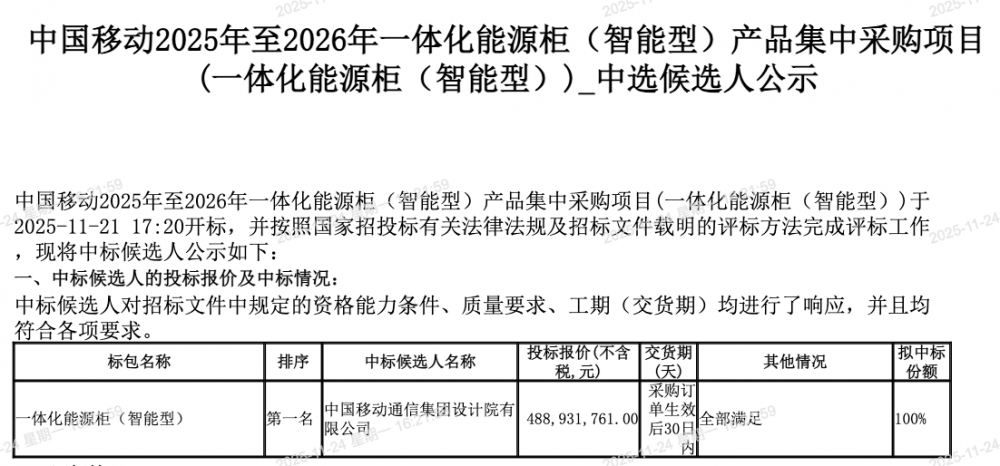 C114讯 11月24日消息(九九)中国移动采购与招标网日前发布2025年至2026年一体化能源柜(智能型)产品集中采购项目中选候选人公示,中移设计院独家中标。