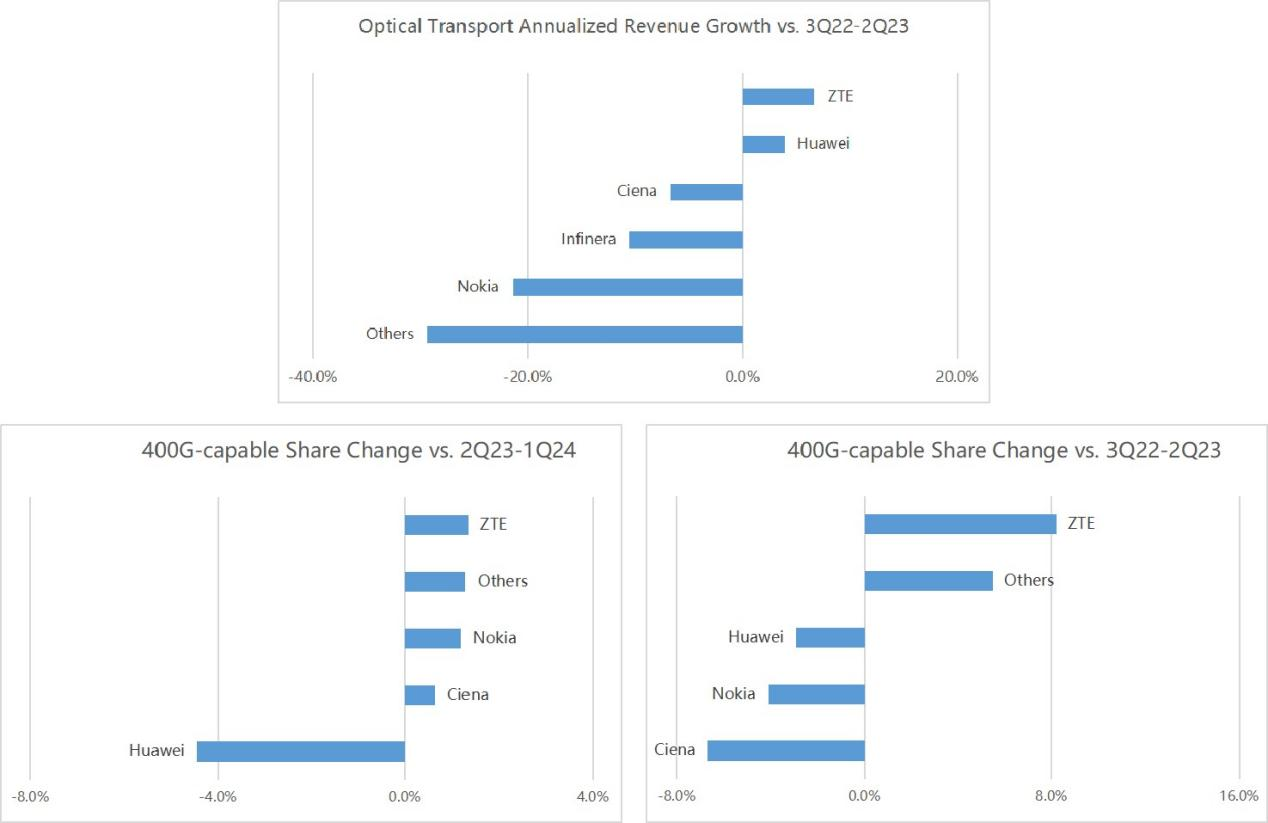 近日,全球知名分析机构Dell’Oro Group发布《光传输季度报告2Q24》。报告显示,中兴通讯的光传输产品在3Q23-2Q24期间收入同比增长第一,其中400G-capable市场份额同比及环比增长也均位居榜首,充分彰显了中兴通讯在Tbit OTN的领先技术水平,并获得市场的高度认可。
