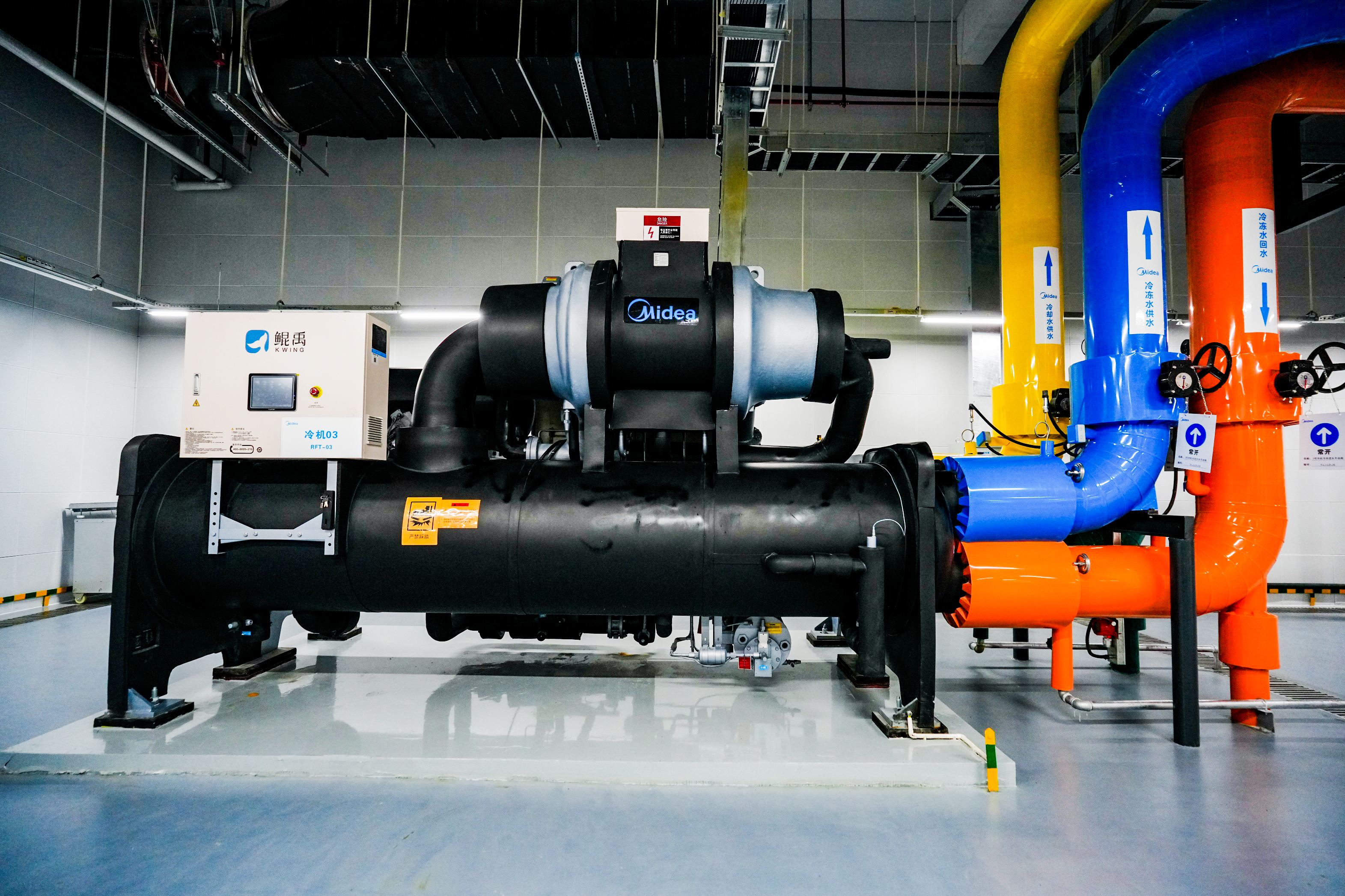 在A栋数据中心一层,36碳见到了冷冻水补冷系统。这是由两台800RT美的变频直驱离心式冷水机组和一台800RT美的变频磁悬浮离心式冷水机组组成,均达到国家一级能效标准,可以提供稳定可靠的辅助制冷。