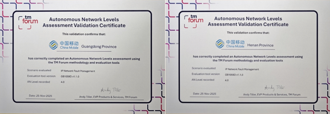 在由全球通信行业权威机构 TM Forum 举办的 Innovate Asia 2025 大会上,中国移动广东分公司与河南分公司获得IP网络故障管理场景(GB1059Dv1.1.0)下的L4级自智网络认证证书,这一认证确立了两家公司在全球运营商中的创新领先地位,并成为业界首次在该场景达到自智网络4.0级别的运营商。