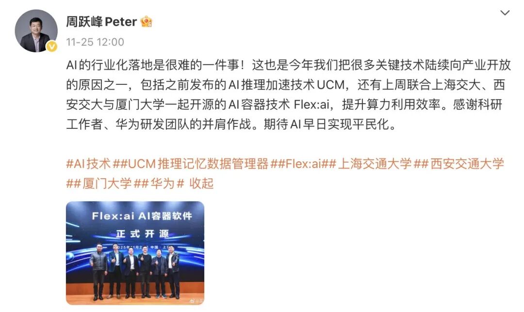 “AI的行业化落地是很难的一件事!这也是今年我们把很多关键技术陆续向产业开放的原因之一,包括之前发布的AI推理加速技术UCM,还有上周联合上海交大、西安交大与厦门大学一起开源的AI容器技术Flex:ai,提升算力利用效率。感谢科研工作者、华为研发团队的并肩作战。期待AI早日实现平民化。”