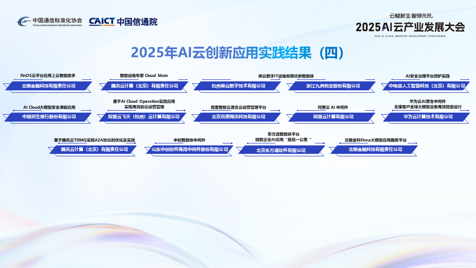 大会发布了2025年AI云创新应用实践结果。随着人工智能技术的飞速发展,智能算力需求逐渐取代通用算力成为算力结构的最主要构成。这一转变推动了云计算服务的升级,催生以人工智能为核心的新型云服务模式——AI云。为促进大模型工程化技术的创新发展,交流业内先进应用实践经验,推广工程化落地先进路径,云计算标准和开源推进委员会启动了“AI Cloud助力大模型场景化和工程化落地”活动。经多轮评审,共有 53 个创新应用实践脱颖而出。