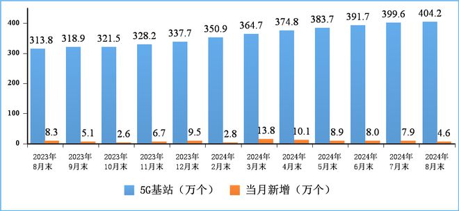5G网络建设持续推进。截至8月末,5G基站总数达404.2万个,比上年末净增66.5万个,占移动基站总数的32.1%,占比较上年末提高3个百分点。