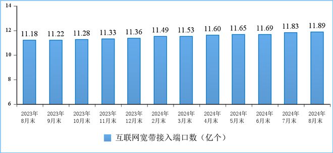 千兆光纤宽带网络建设有序推进。截至8月末,全国互联网宽带接入端口数量达11.89亿个,比上年末净增5278万个。其中,光纤接入(FTTH/O)端口达到11.48亿个,比上年末净增5343万个,占互联网宽带接入端口的96.6%。截至8月末,具备千兆网络服务能力的10G PON端口数达2707万个,比上年末净增405.4万个。