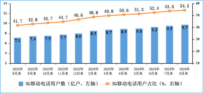5G用户规模持续扩大。截至8月末,三家基础电信企业及中国广电的移动电话用户总数【注1】达17.78亿户,比上年末净增3452万户。其中,5G移动电话用户达9.66亿户,比上年末净增1.44亿户,占移动电话用户的54.3%,占比较上年末提高7.7个百分点。