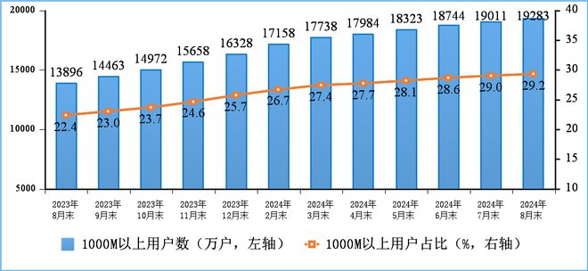 千兆用户快速发展。截至8月末,三家基础电信企业的固定互联网宽带接入用户总数达6.59亿户,比上年末净增2307万户。其中,100Mbps及以上接入速率的固定互联网宽带接入用户达6.25亿户,占总用户数的94.8%;1000Mbps及以上接入速率的固定互联网宽带接入用户达1.93亿户,比上年末净增2955万户,占总用户数的29.2%,占比较上年末提升3.5个百分点。在高速率用户持续增长拉动下,家庭户均接入带宽达494.7Mbps/户,同比增长15.5%。
