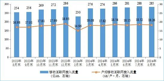 移动互联网流量较快增长,8月DOU值位于较高水平。前8个月,移动互联网累计流量【见注1】达2176亿GB,同比增长12.5%。截至8月末,移动互联网用户数【见注1】达15.63亿户,比上年末净增3879万户。8月当月户均移动互联网接入流量(DOU)达到18.26GB/户·月,同比增长7.4%,比上年同期提升1.26GB/户·月。