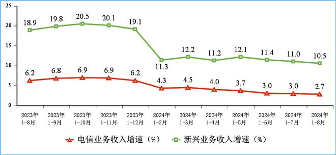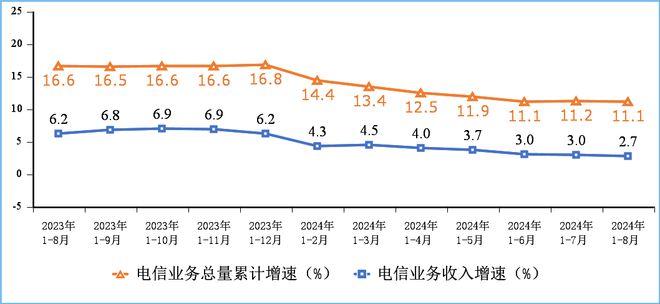 电信业务总量保持两位数增长,电信业务收入增速稳中有落。前8个月,电信业务收入累计完成11732亿元,同比增长2.7%。按照上年不变价计算的电信业务总量同比增长11.1%。