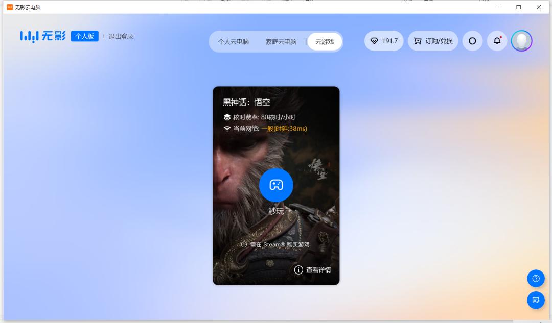 此外,无影云电脑的客户端也在个人云电脑和家庭云电脑的选项之外额外给出了云游戏的栏目,只要在steam上购买了黑悟空即可一键配置,开启秒玩。