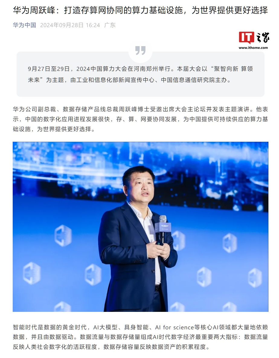 IT之家 9 月 28 日消息,在 9 月 27 日-29 日举行的 2024 中国算力大会期间,华为公司副总裁、数据存储产品线总裁周跃峰受邀出席大会主论坛并发表主题演讲。