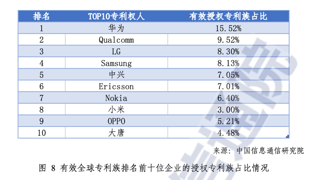5G全球有效专利族中,前十名分别是华为、高通、LG、三星、中兴、爱立信、诺基亚、小米、OPPO和大唐。华为占比为12.42%排名第一,中兴占比为6.97%排名第五。如下: