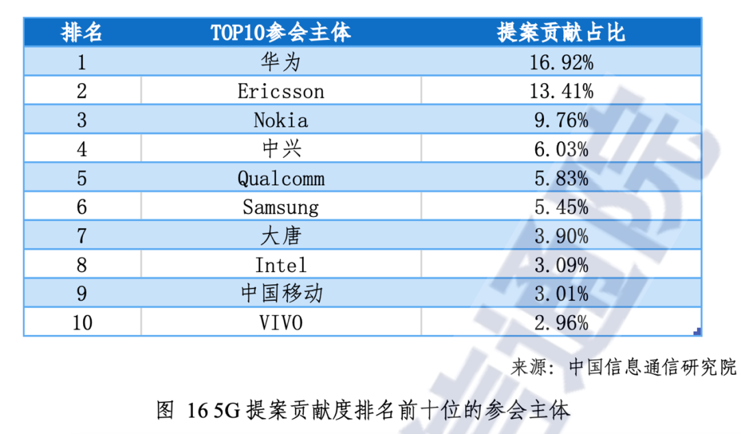 报告还提到,基于5G提案量占比的提案贡献度,直观反映了企业在5G标准化过程中的参与积极性和贡献程度,也在一定程度上反映了企业5G技术研发投入和技术创新实力。提案贡献度排名前十位参会主体的提案总量占全部5G提案的70.36%。华为的5G提案贡献度为16.92%,排名第一;爱立信的占比是13.41%,排名第二,诺基亚以9.76%的占比排在第三,中兴以6.03%的占比排名第四位。