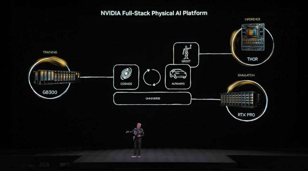 老黄提到,仿真是整个体系的核心,只有在可控的数字环境中,AI才能反复尝试、评估行为后果,并逐步建立对世界的理解。