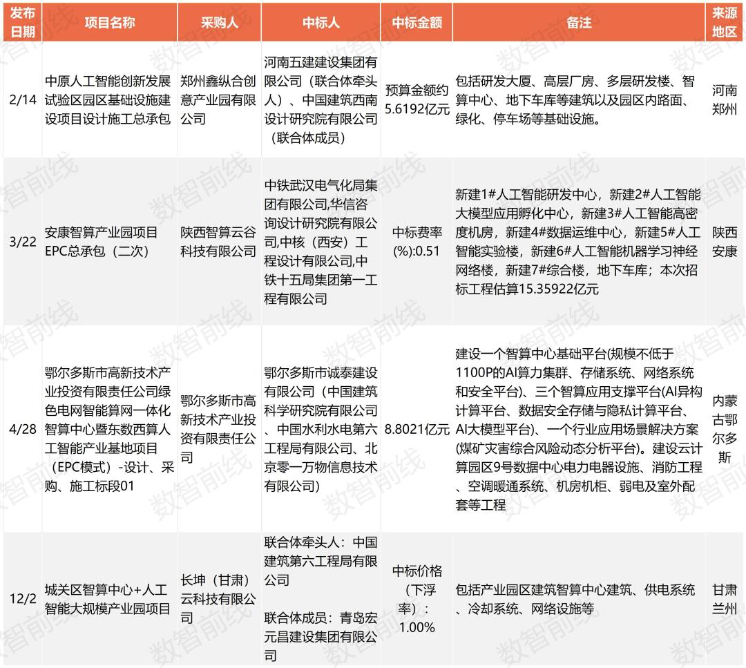 最近,数智前线通过中国政府采购网、中国招投标公共服务平台、天眼查、企查查、寻标宝等渠道梳理发现,2025年的公开招投标市场上,围绕土建基础设施、IT基础架构、服务器采购等方方面面的建设内容,国内单个中标金额亿元以上的智算中心、数据中心相关项目在222个以上。在这些项目中,我们看到了一些值得关注的趋势和特征: