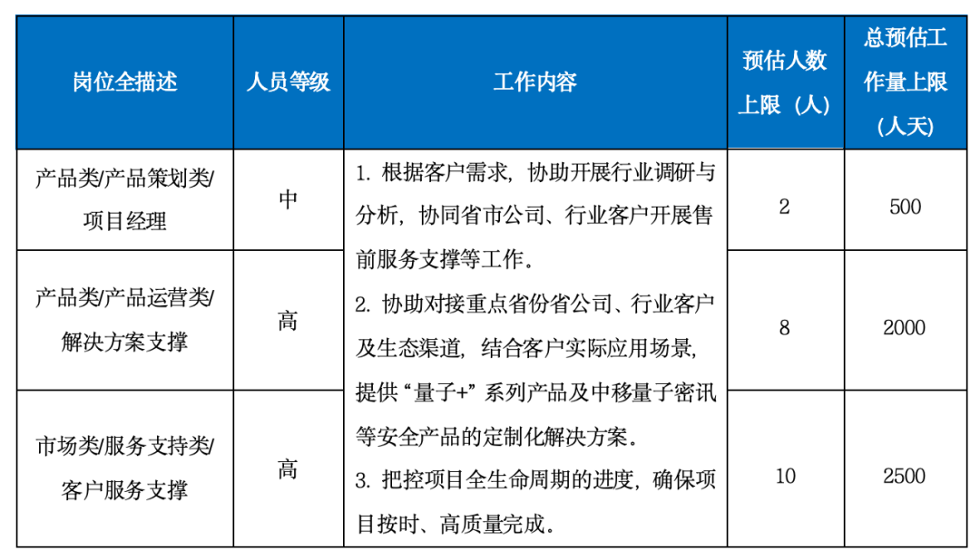 本项目计划采购2家供应商,主要负责开展中移量子密讯、“量子+”系列产品面向重点省专公司、行业客户的售前服务支撑工作。
