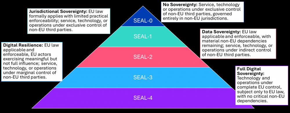 每个领域会根据不同的权重获得相应的分数,根据总分(见图1),云服务被划分为五个“主权有效性保障等级”(Sovereignty Effectiveness Assurance Level,SEAL)之一,范围从SEAL-0(表示不具备主权)到SEAL-4(表示拥有完全的数字主权)(见图2)。