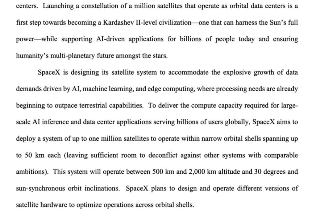 “为满足服务全球数十亿用户的大规模AI推理和数据中心应用所需的算力,SpaceX计划部署一个最多由100万颗卫星组成的系统。这些卫星将在宽度不超过 50 公里的狭窄轨道壳层内运行(留出足够的空间,以避免与其他具有类似目标的系统发生冲突)。”