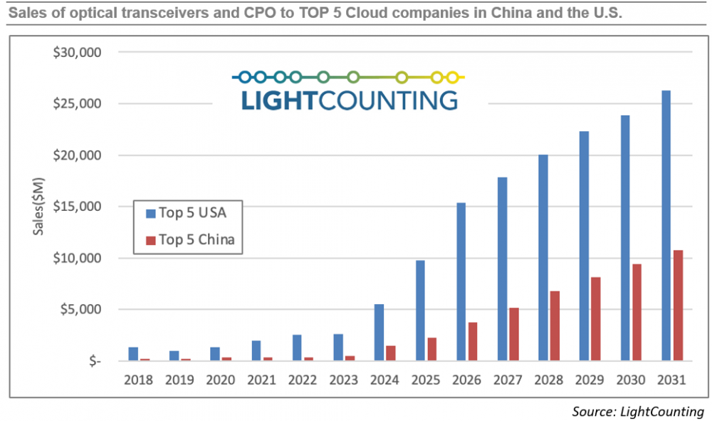 下图展示了LightCounting对中美前五大云服务商的以太网光模块及CPO/NPO采购额估算。根据最新预测,中美之间的差距正快速缩小:从2022年的7倍,降至2024年-2025年的4倍,预计到2031年将进一步缩小至2.5倍。2025年-2031年期间的复合年增长率存在显著差异:美国市场为18%,而中国市场高达29%。