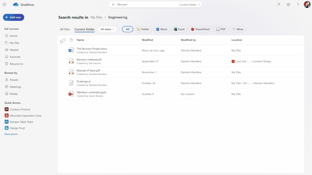 搜索结果页面显示文件的创建者和最后更新者,提供文件所有权和活动的即时情境信息。
