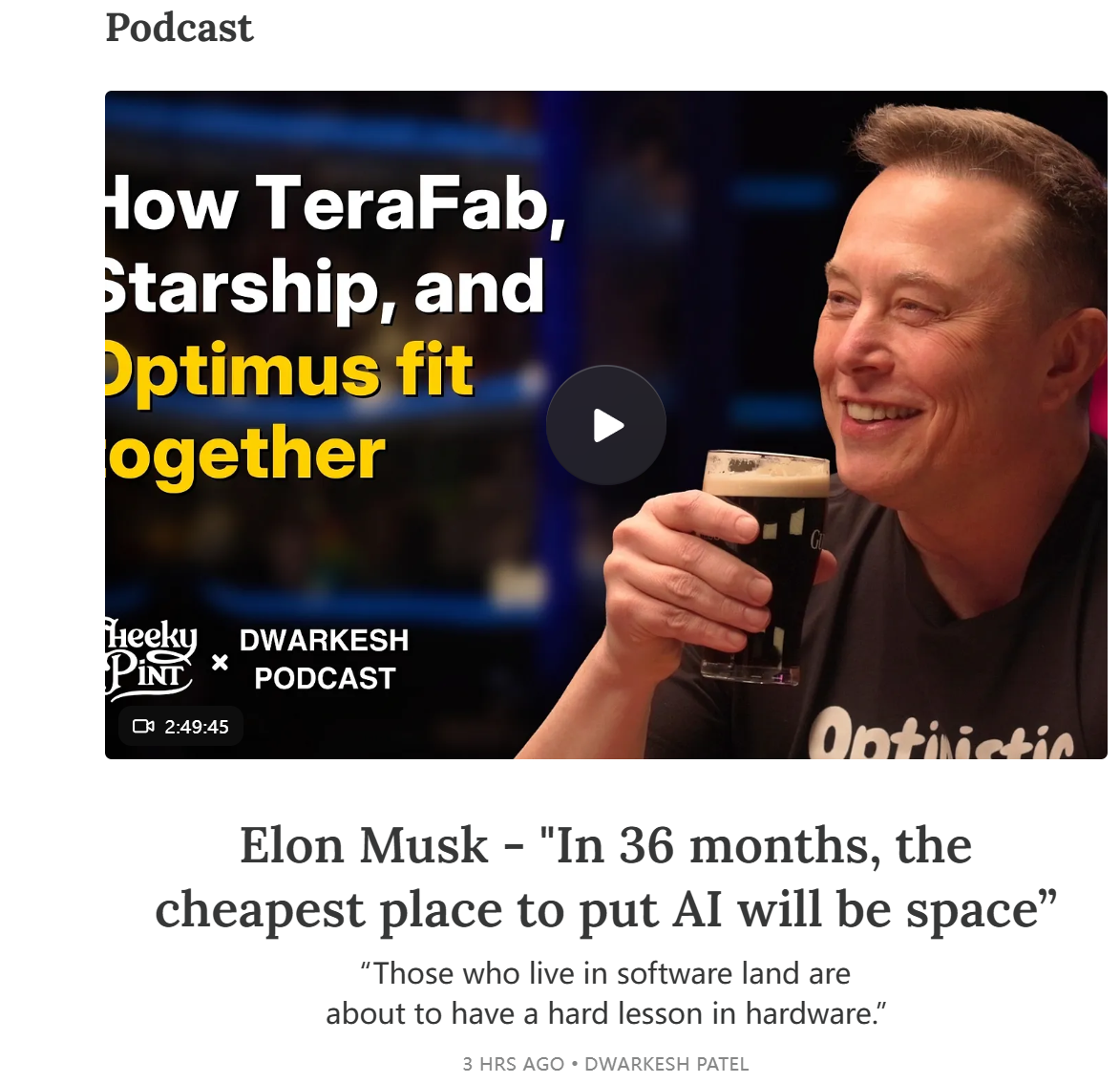财联社2月6日(编辑 史正丞)北京时间周五凌晨,马斯克作客知名科技访谈播客Dwarkesh Podcast的节目上线。作为全球资本市场热点话题的“太空GPU”,又获得世界首富的重点阐述。