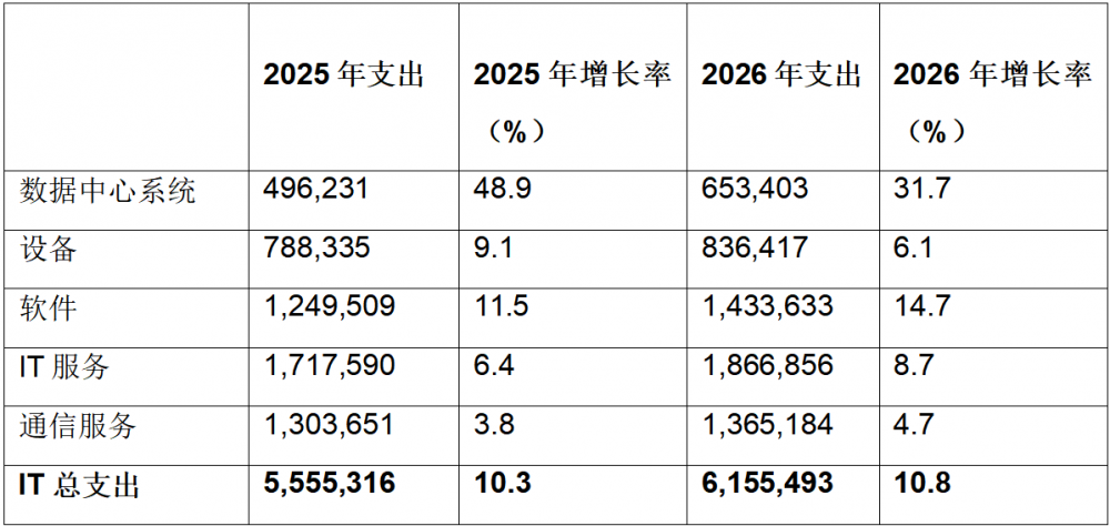商业与技术洞察公司Gartner最新预测显示,2026年全球IT支出预计将达到6.15万亿美元,较2025年增长10.8%。