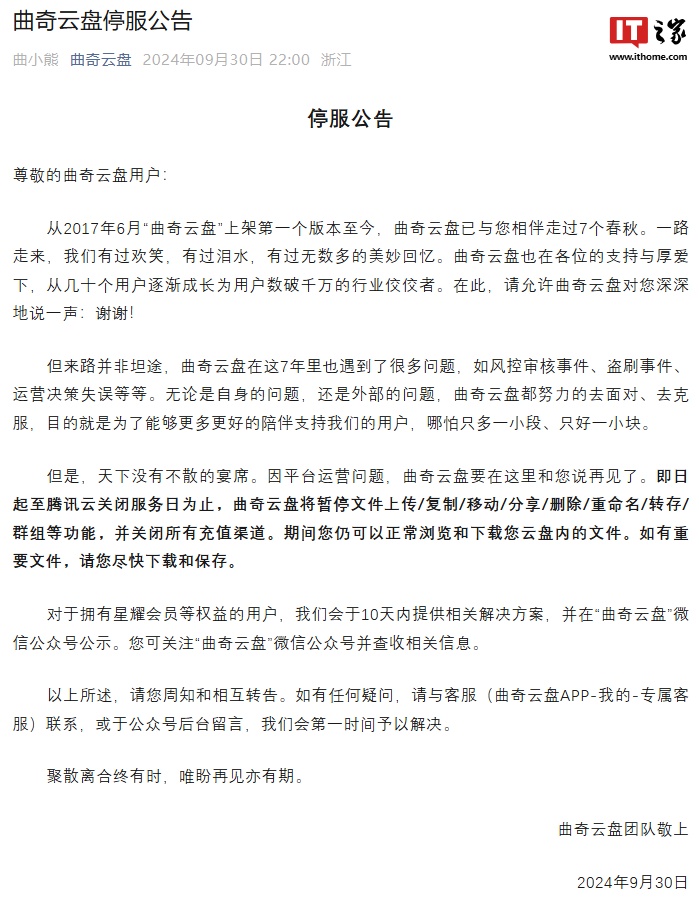 IT之家附曲奇云盘停服公告重点如下: